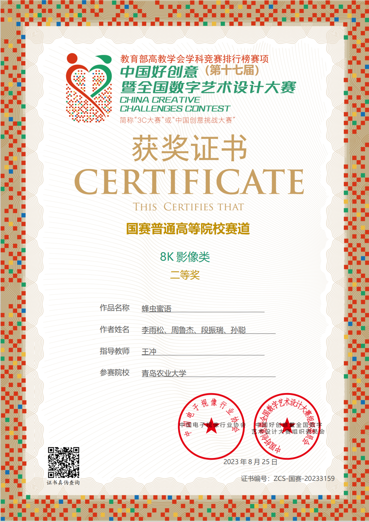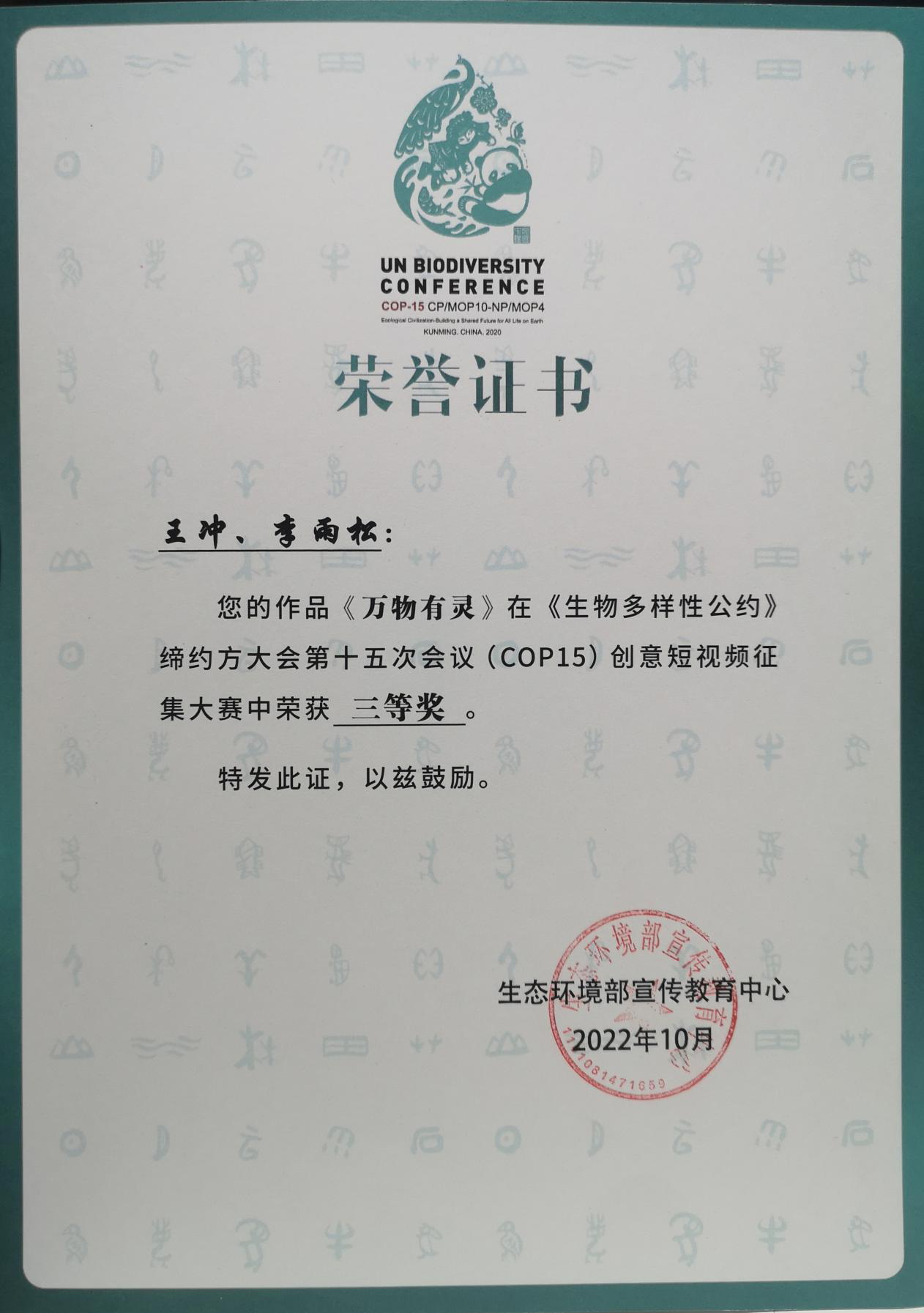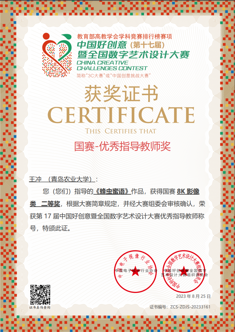 1、艺术作品:2022年,由王冲老师指导的生物艺术影像作品《万物有灵》获得第十六届国赛中国好创意大赛一等奖,同时该作品获得中国生态环境部三等奖。2023年,由王冲老师指导的生物艺术影像作品《蜂虫蜜语》获得第十七届国赛中国好创意大赛二等奖。