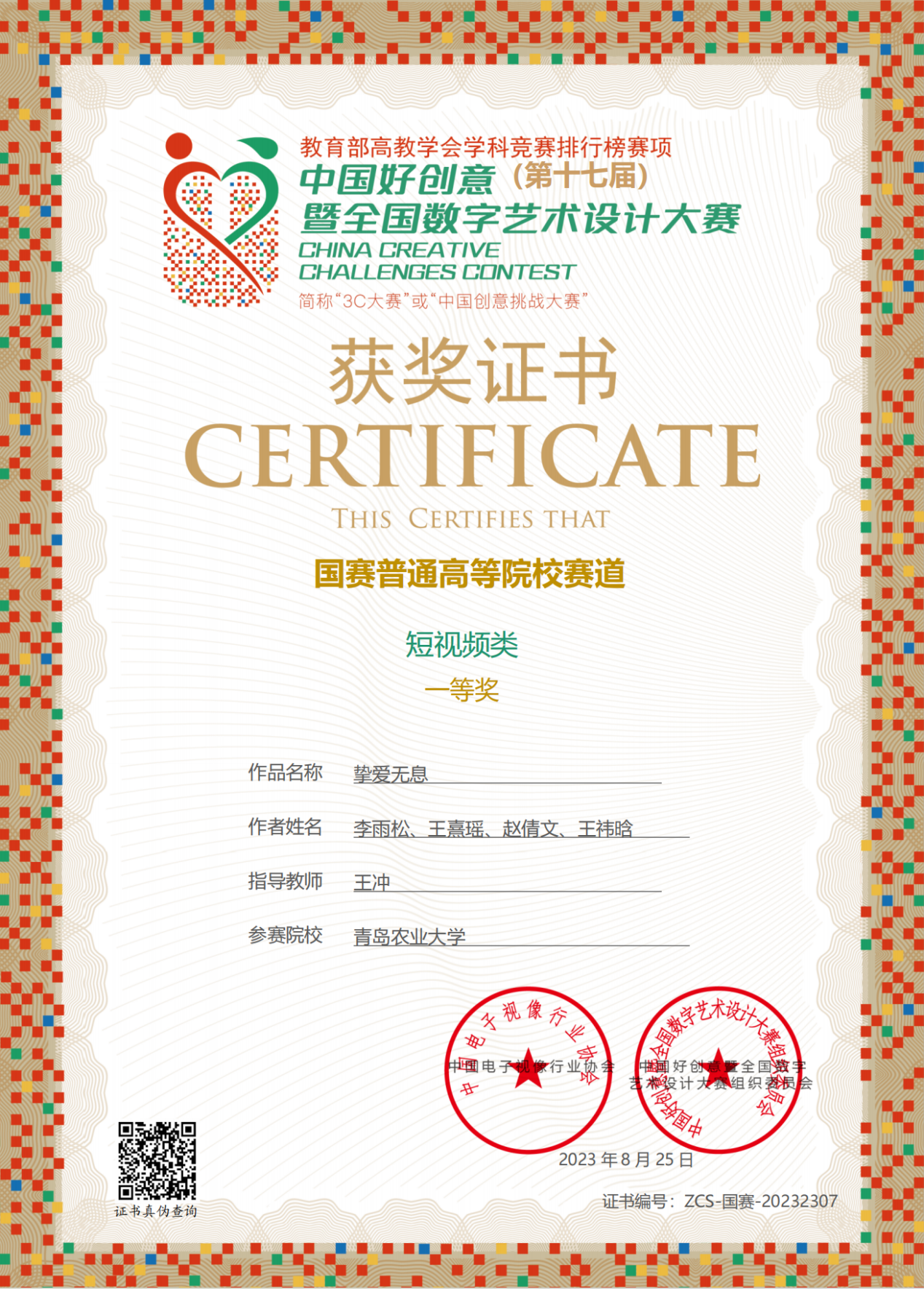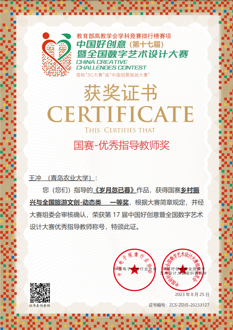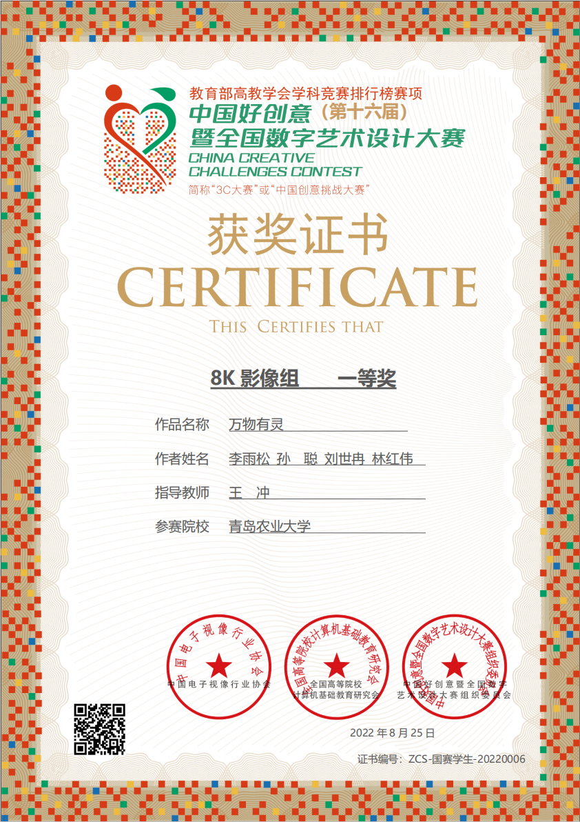 1、艺术作品:2022年,由王冲老师指导的生物艺术影像作品《万物有灵》获得第十六届国赛中国好创意大赛一等奖,同时该作品获得中国生态环境部三等奖。2023年,由王冲老师指导的生物艺术影像作品《蜂虫蜜语》获得第十七届国赛中国好创意大赛二等奖。