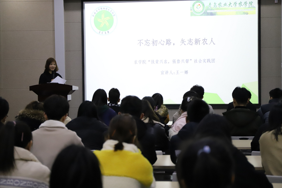 首先,来自农公司“扶贫兴农,强鲁兴邦“社会实践队的王一娜同学进行了“不忘初心路,矢志新农人”的实践宣讲。整个宣讲围绕社会实践是什么以及为什么要进行的问题而展开。王一娜通过视频介绍了所在实践队的准备情况、开展情况、成果宣传情况。通过自身在西七里河的社会实践经历以及农公司”七年坚守“的故事来强调实践活动是对情感、责任的传承,是对初心的守护。广大青年要牢记习近平总书记的殷切期望,要争做有理想、有本领、有担当的新型人才,更要为打赢脱贫攻坚战,乡村全面振兴贡献农大青春力量。