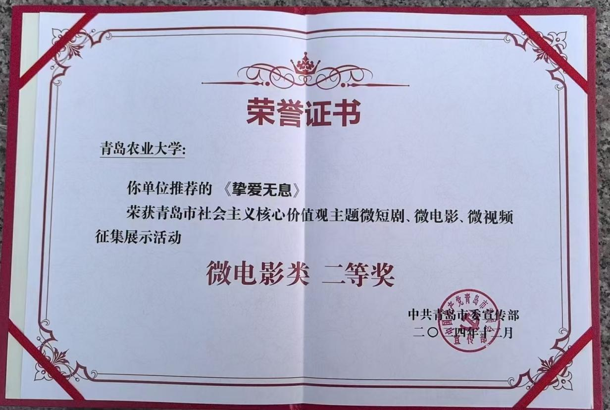 本次征集活动旨在挖掘和展示青岛市的优秀文化故事,通过微短剧、微电影、微视频等形式,生动诠释社会主义核心价值观的深刻内涵,进一步推动社会主义精神文明建设。活动自启动以来,得到了社会各界的广泛关注和积极参与,共征集到600部作品。经过专家评审团的严格评审,最终评选出一等奖3个、二等奖5个、三等奖8个以及优秀奖22个。王冲老师的微电影作品《挚爱无息》以其独特的视角、深刻的主题和精湛的制作技艺,赢得了评委们的一致好评,荣获了微电影类二等奖。