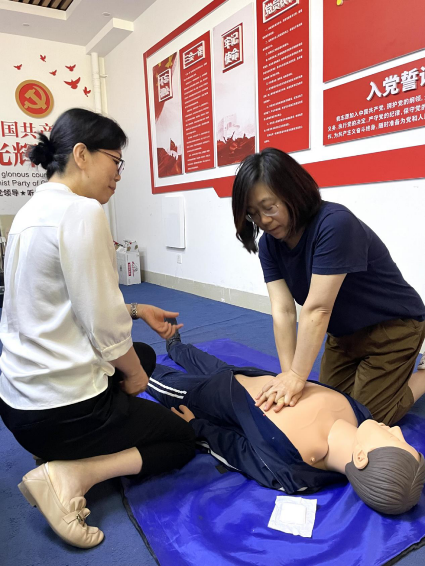 随后,全体教职工开展甲状腺咨询、心肺复苏实践模拟、中医问诊活动。城阳人民医院医生针对教职工身体状况一对一提出保养和治疗建议,现场指导教职工开展心肺复苏活动。