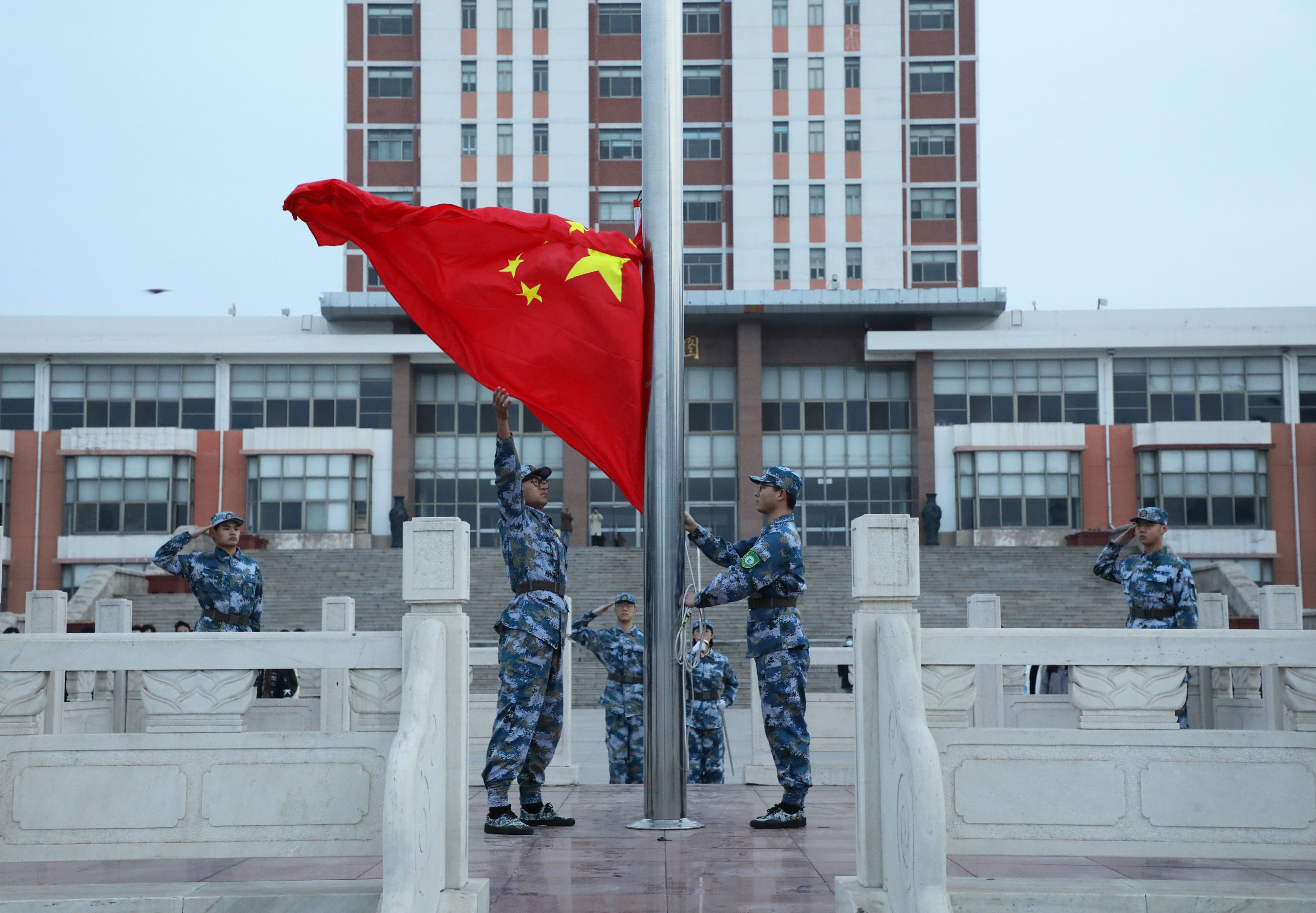 迎着清晨的朝阳,国旗护卫队的旗手们英姿飒爽、迈着铿锵有力的步伐护送国旗走向升旗台,伴随着庄严的国歌,升旗手振臂一挥,五星红旗冉冉升起,升旗仪式正式开始。全体师生高唱国歌,庄严肃立,行注目礼。